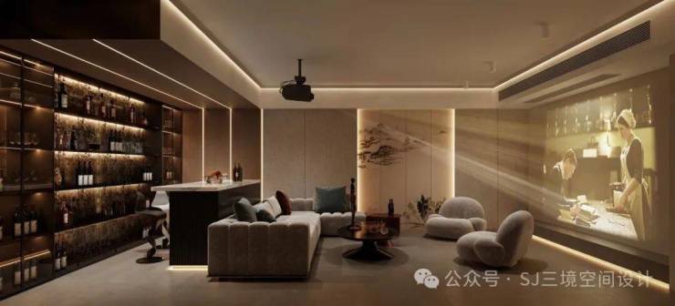 ③酒柜与观影区一体化打造,深色酒柜配内嵌灯光显质感,山水纹样软包背景墙注入东方气韵,实现 “品酒 + 观影” 的复合休闲功能。