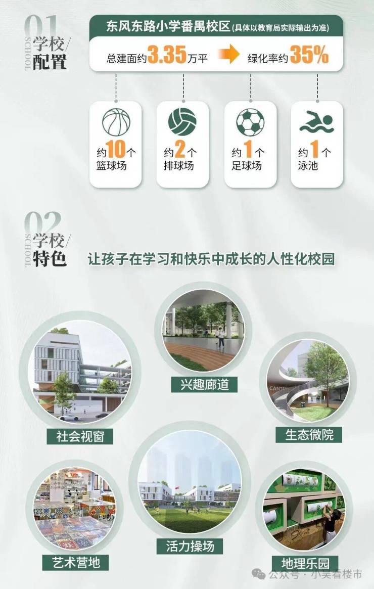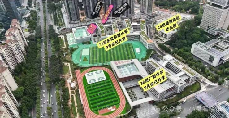 项目自身带有一所21班幼儿园{广东省番禺实验幼儿园},和72班公立小学{东风东小学},还有36班公办中学{广雅初中},基本上都确定为省一级学校,虽然现在遍地都是挂牌名校,但是有总比没有好,学校就在小区旁边,接送都很方便,这里的业主子女在家门口就能实现12年教育。