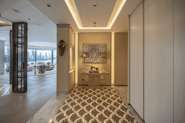 • 细节较真到离谱: 弧形墙面不用拼接工艺,直接整块意大利洞石切割;实木地板要进实验室做7天7夜温湿循环测试,就为了适应江畔环境;电视背景墙用普拉达绿奢石,卫生间铺香格里拉翡翠、米兰红奢石, 嘉格纳 电器、德国雅生龙头、土耳其巴斯蒂姆五金,全是行业顶尖品牌;