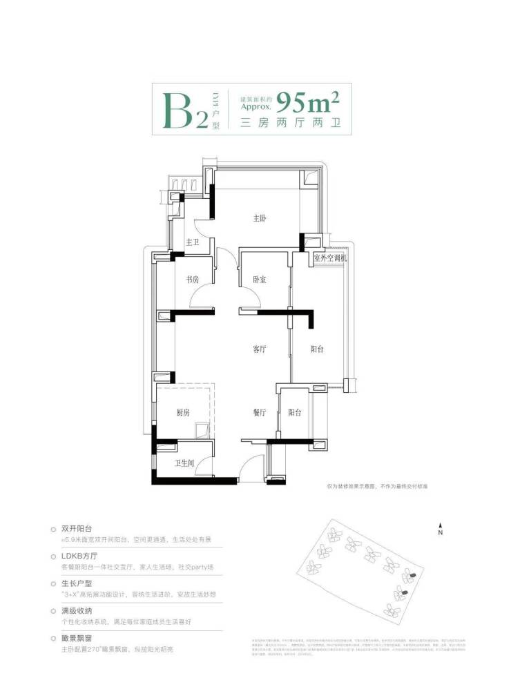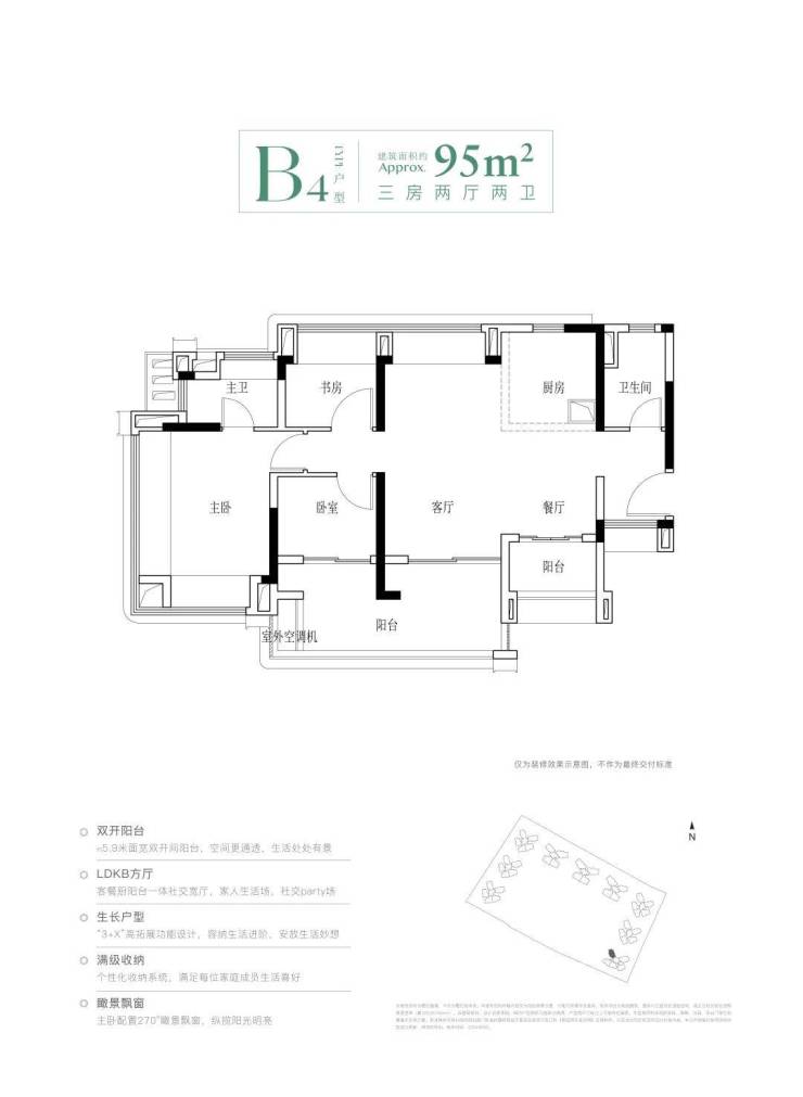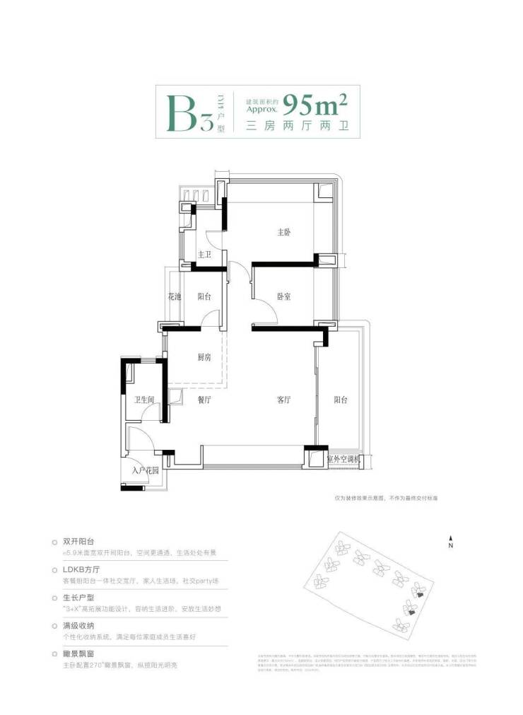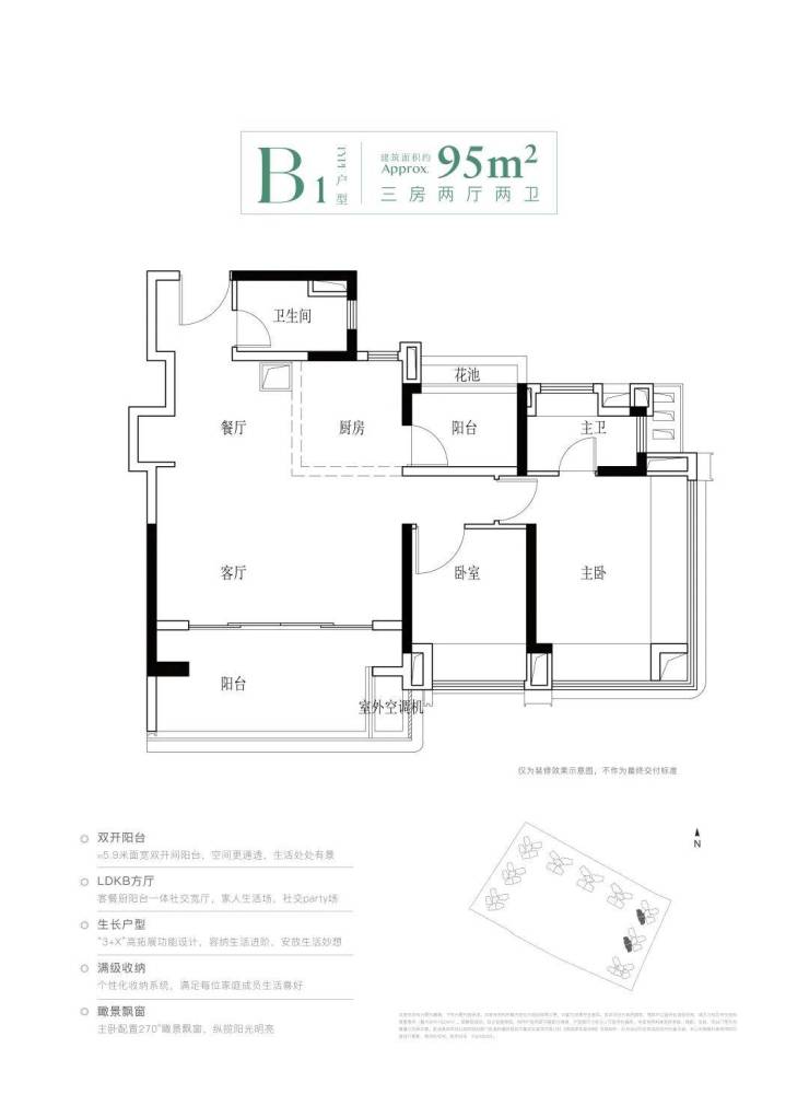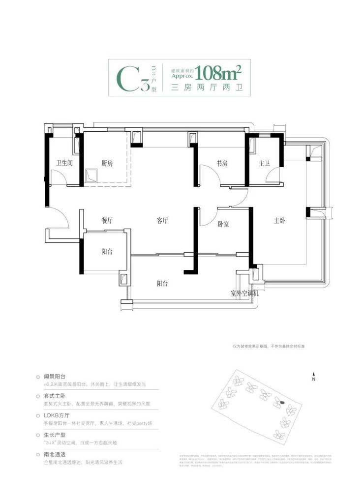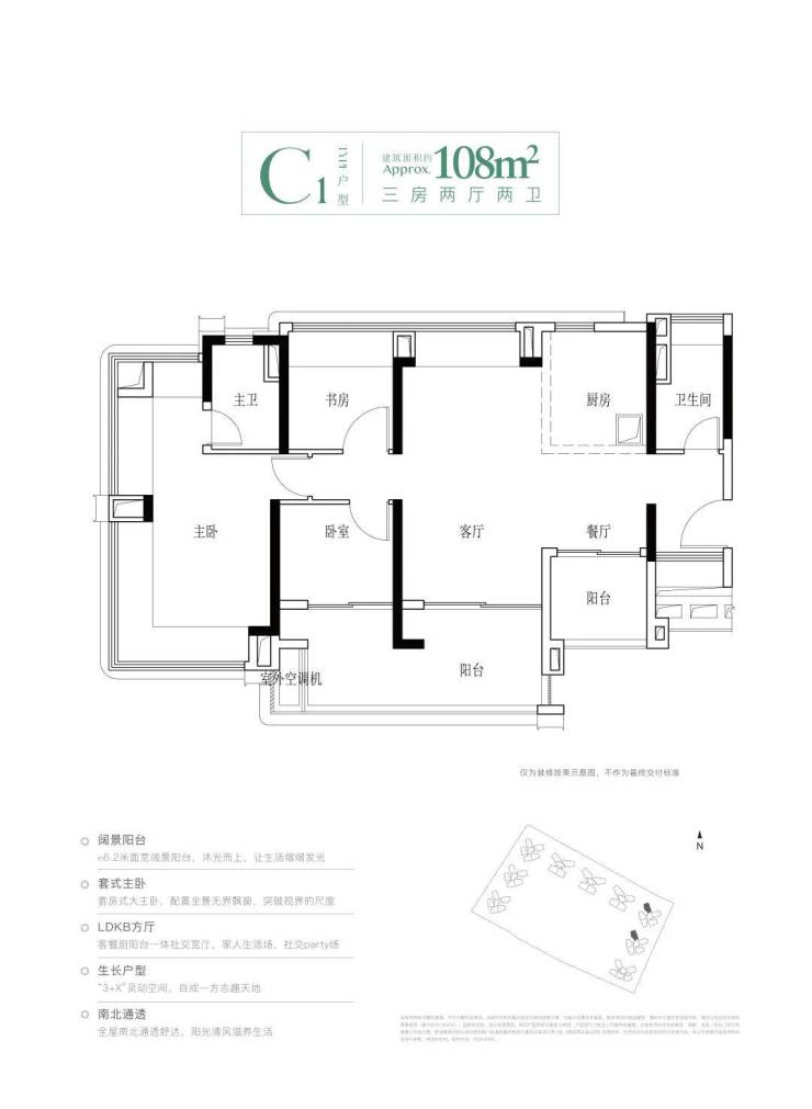 108㎡3+1房位于1、2栋朝向和景观相对较好的梯腿,属于95㎡的进阶。