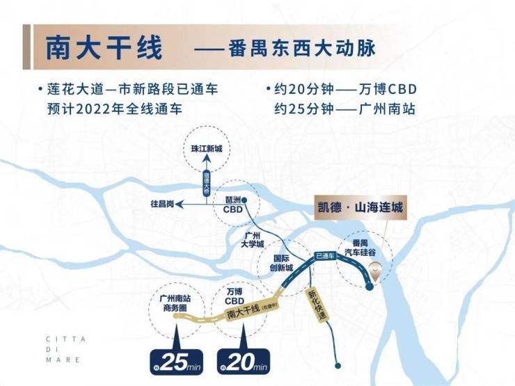 项目东临狮子洋、南望莲花山, 邻近广州大学城、万博CBD、思科智慧城、广汽研究院及莲花山高尔夫球会等高端城市资源配套。