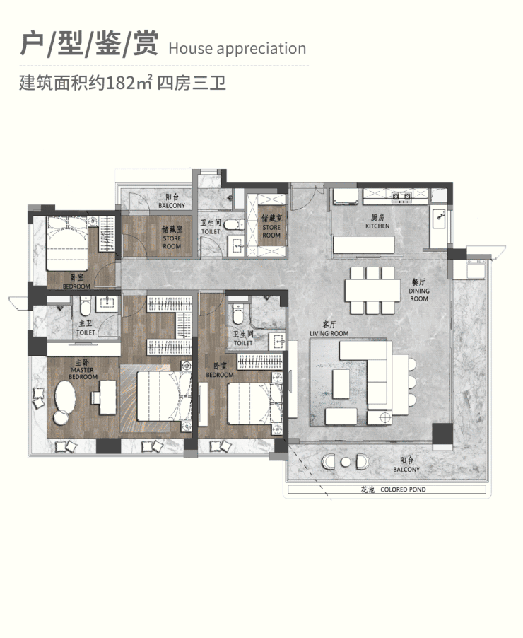 这里既有建面约128-142平四房,为城市新贵而来;也有建面约179-182平四房,满足财富阶层对尺度生活的需求。