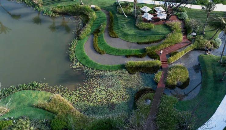 峡谷西侧7期作为最欢乐热闹的溪谷公共活动区,由庆典草坪、金色池塘、雨林商业街、亲子戏水区组成。金色池塘借助自然的高差错落,塑造了一处野趣梯田池塘,日闻蝉鸣,夜听蛙声。彼岸是雨林风情商业街,美轮美奂的夕阳观赏点,阳光照在池塘上,泛起粼粼金光。