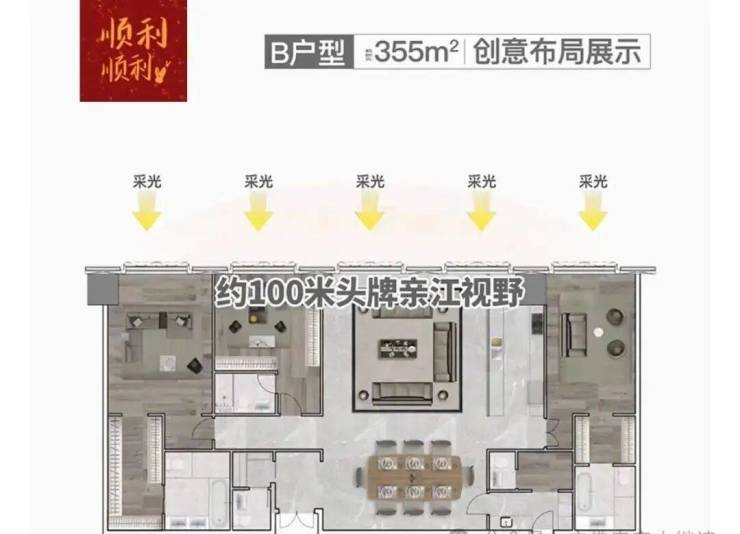 建面约355㎡户型,板式方正格局,一体化双厅,收揽一线江景与繁华。