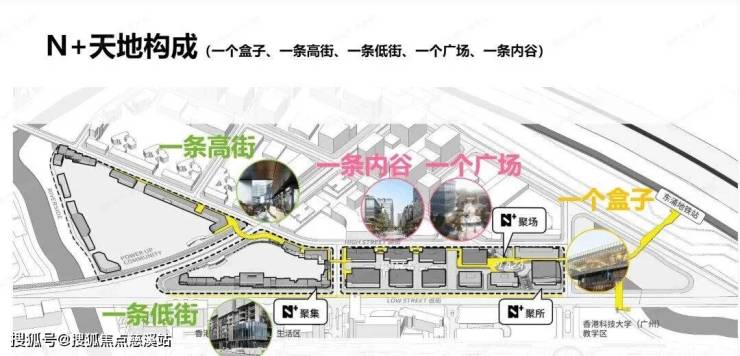“一个高街” 即超级空中连廊,串联产学研居 4 大板块,无缝连接重要场所;“一个低街” 是约 1.17 万㎡的活力商业街区,汇聚越秀服务生态文创店、港科大的实验店等,充满港味生活气息;“一个广场” 呼应港科大红鸟广场,是 “三区合一” 的起点;“一个盒子” 结合香港文化及设计,设置创新展览办公空间,配备轻餐饮等功能,是板块艺术商业标杆建筑。