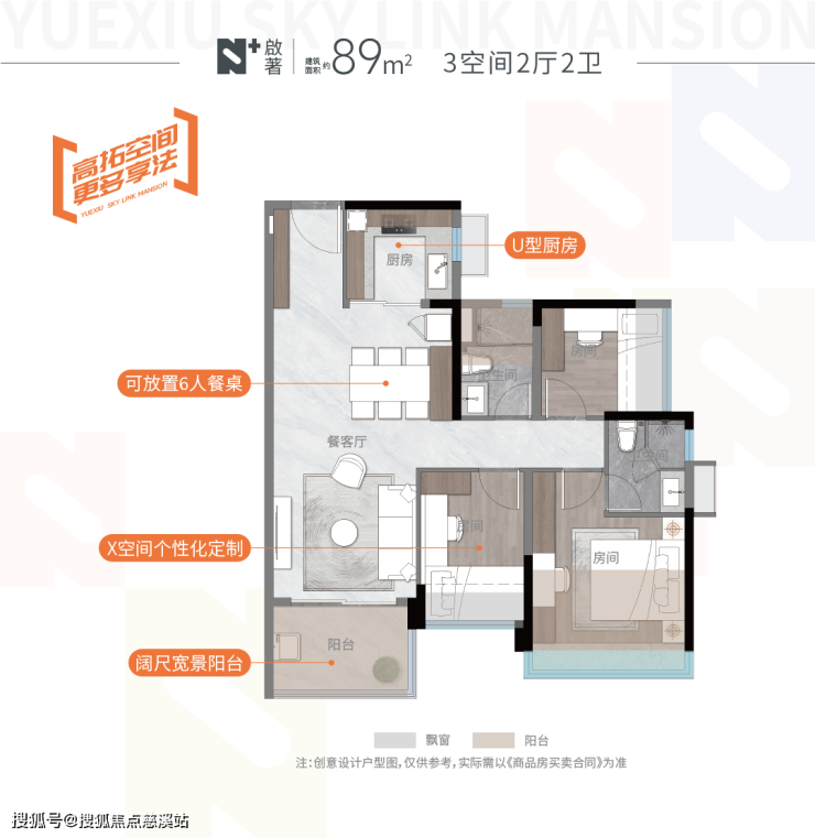 建面约89-169㎡跃级三至四房,跨界共融共生的多元融合。户型均有LDKB互通,保证舒适通风采光及与家人交流互动空间。采用20%阳台建设比例项目,做到2-2.4m的加宽阳台,约800mm进深新规飘窗,相当于增加0.7-0.9㎡使用空间。