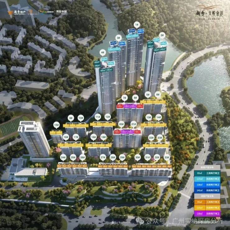 户型:小高层95㎡/125㎡三四房、超高层96㎡三房、125㎡/141㎡四房、底叠150-200㎡三四房