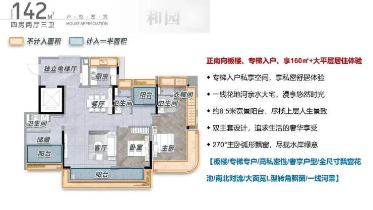 142方,2梯2户+独梯入户的设计,将私密性拉满,厅出阳台即是花地河水景,双主卧大面积+8.5m宽景阳台的设计满足多使用场景,北阳台可望花地河水景,南飘窗可望园林,景色全览。