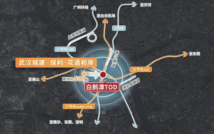 步行约800米可到1号线芳村站,四线合一超级枢纽(包含1号线已开通,11号线已开通,22号线建设中,28号线规划中),轻松链接全城,未来0换乘直达广州站、广州南站、白云机场等重要交通枢纽。