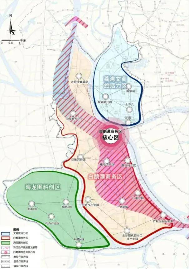 三平台:荔湾文商旅活力汉、白鹅潭商务区、海龙围科创区;