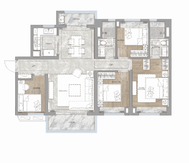 120㎡的平层四房两卫的户型,也是该盘唯一一个平层,是经典的横厅双阳台对流设计,格局方正,实用率高,四开间朝南的布局,通风采光都很好 。