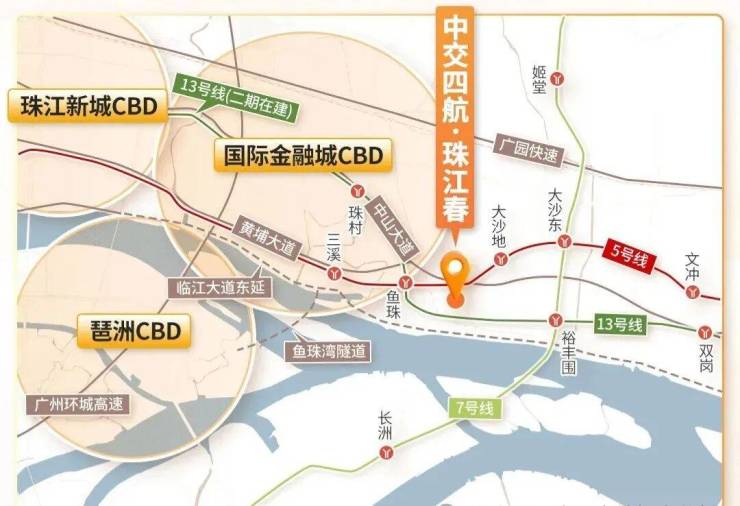 项目距离地铁5号线鱼珠站和大沙地站双地铁站约800米,目前就能通过地铁5号线直达金融城、珠江新城,未来13号线二期开通后,也通过鱼珠站直抵珠江新城。