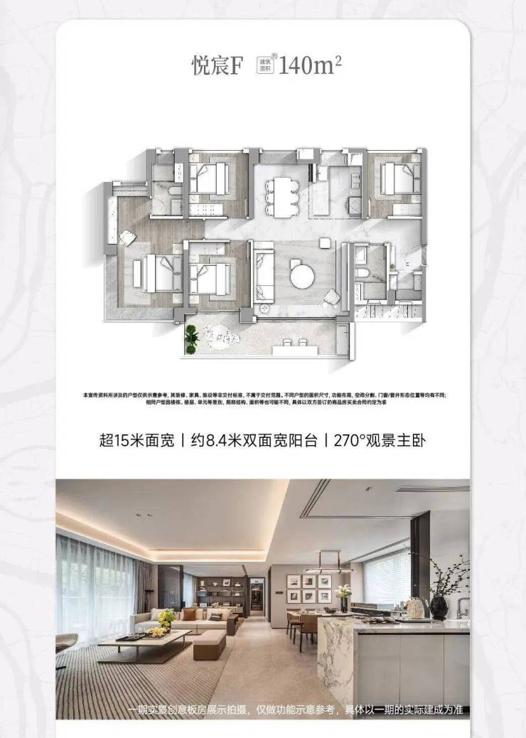 悦宸F户型(140㎡)亮点:4.85米横厅、8.4米双面宽景阳台、主卧套房设计。