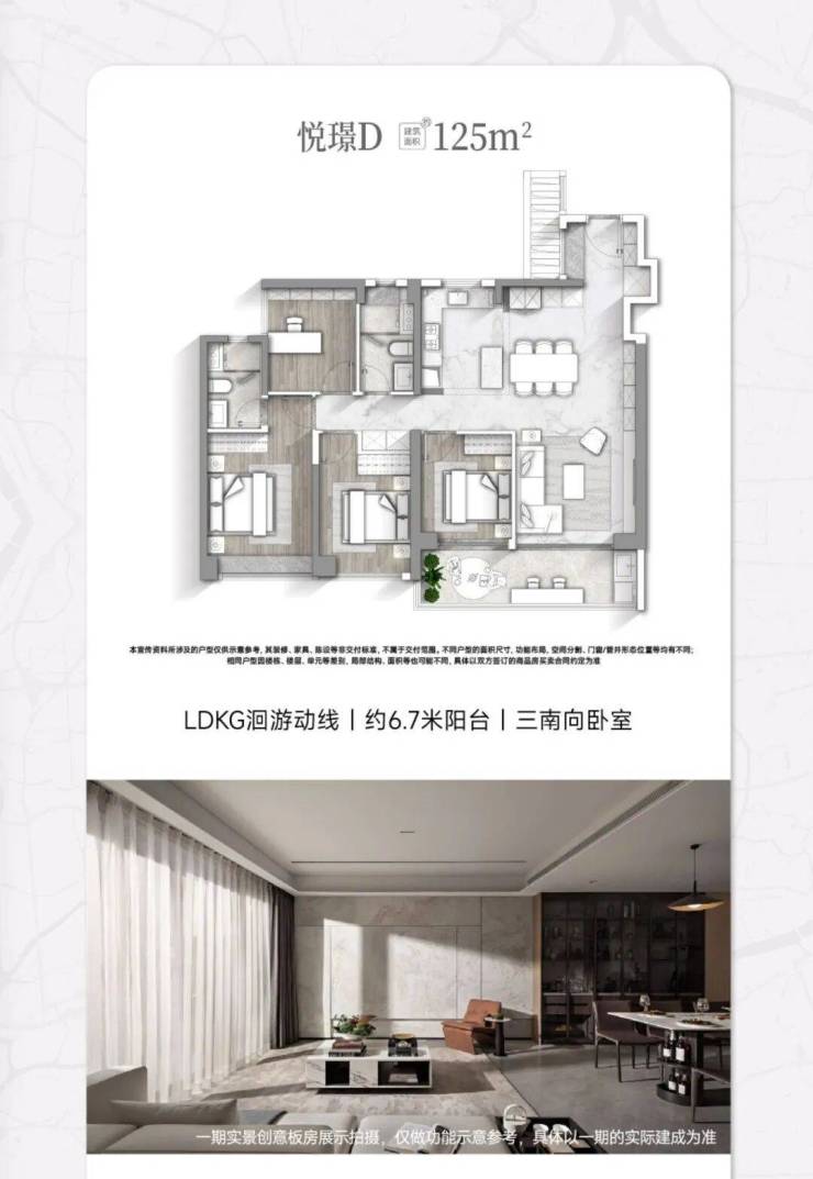 悦璟户型(123㎡)亮点:三南向卧室、6.6米双面宽阳台、LDKG一体化设计、主卧270°飘窗。