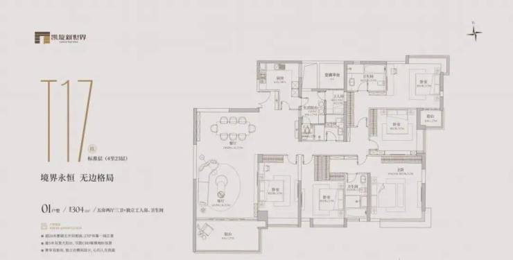 面积为304㎡,分布在t23栋的3-8层及t17栋的3-26层,2梯3户或2梯4户,有五房两卫或五房三卫。