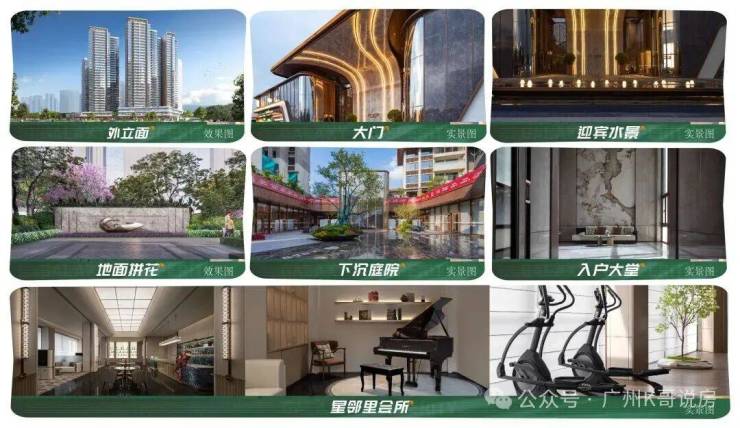 超甲级写字楼同款外立面, 约9.6米高鲲鹏展翅“鲸鱼尾”大门, 造价约50万上海宝格丽同款迎宾水景, 人工费超10万安缦酒店同款地面拼花,约550m²酒店式下沉庭院,约10米高尊崇归家入户大堂,9大主题星邻里会所。