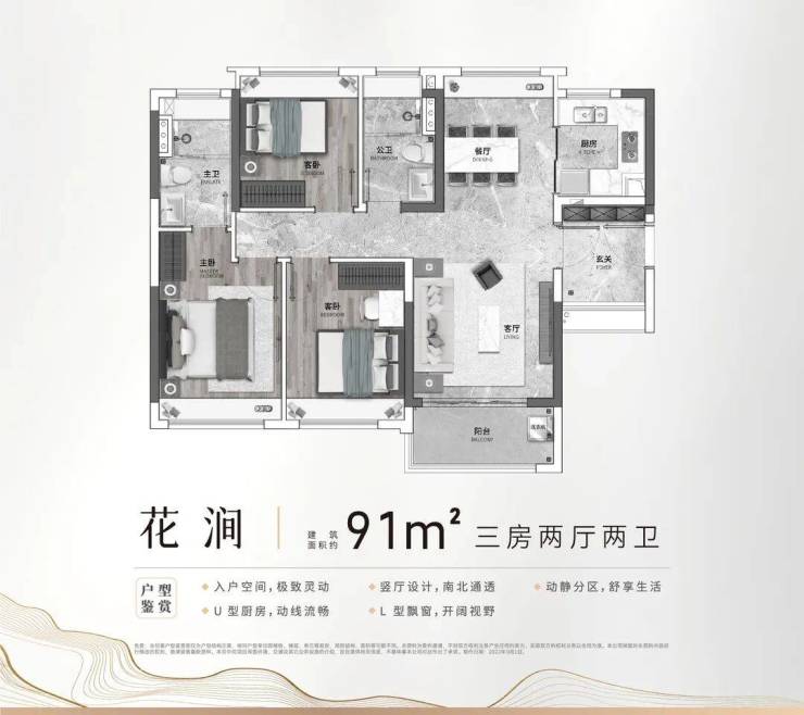 户型整体动静分离,能保证休息空间的安静,主卧不仅为套房设计,还能做到真正的南北通透,清风可无遮挡穿过。