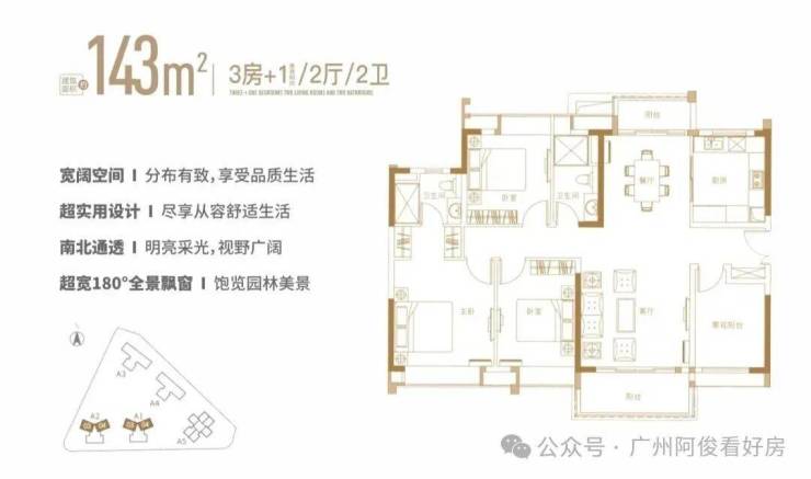 户型实用:主力89-143㎡三至四房,南北双阳台、270°飘窗设计,得房率80%。