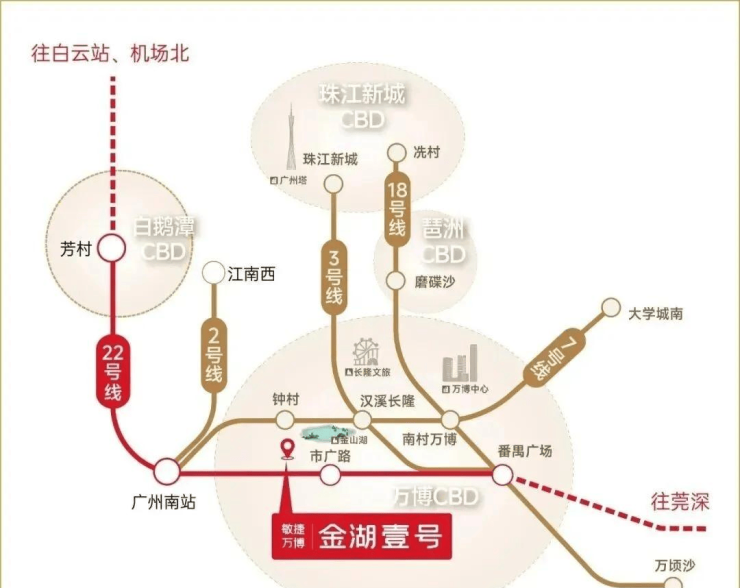 ◎【双地铁交汇】22号线(已开通)及26号线(规划中)双地铁交汇,约800米市广路地铁站, 1站番禺广场、2站万博中心,3站琶洲CBD、4站珠江新城。