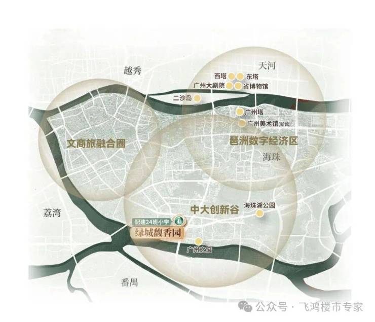绿城馥香园雄踞广州城市中轴(天河北-珠江新城-广州塔)与海珠湾心交汇处,坐拥“琶洲数字经济区、文商旅融合圈、中大创新谷”三大产业板块资源。这一战略性的位置意味着居民既能享受城央繁华,又能便捷通达全城。