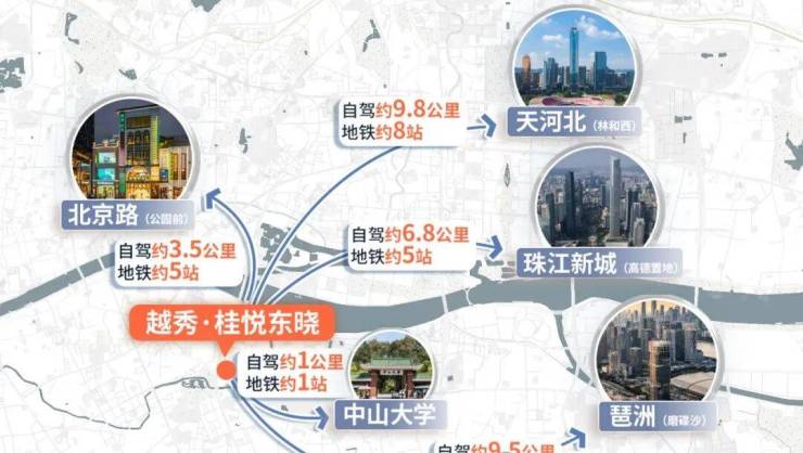 ✔五大主干道串联主城,咫尺越秀、瞬达天河,距离约8km内(约20分钟)通达珠城琶洲