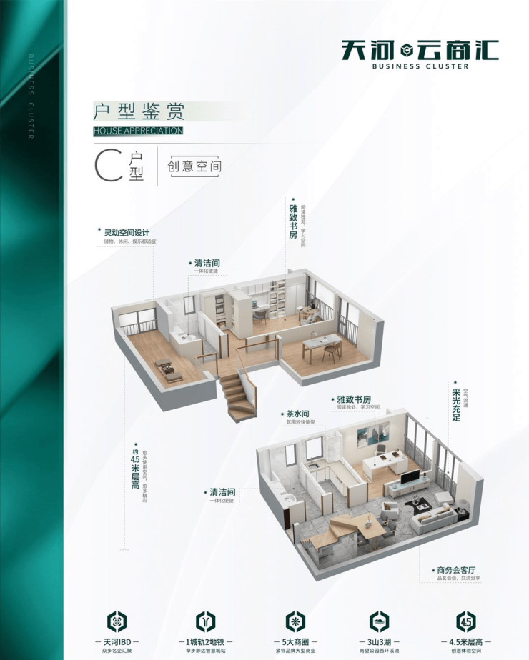 项目容积率仅2.0,全市罕有,筑造创意空间及企业公馆两大产品系,打造成集泛会所、创新创业、社交平台、休闲娱乐等于一体的全能型理享生活家场域。