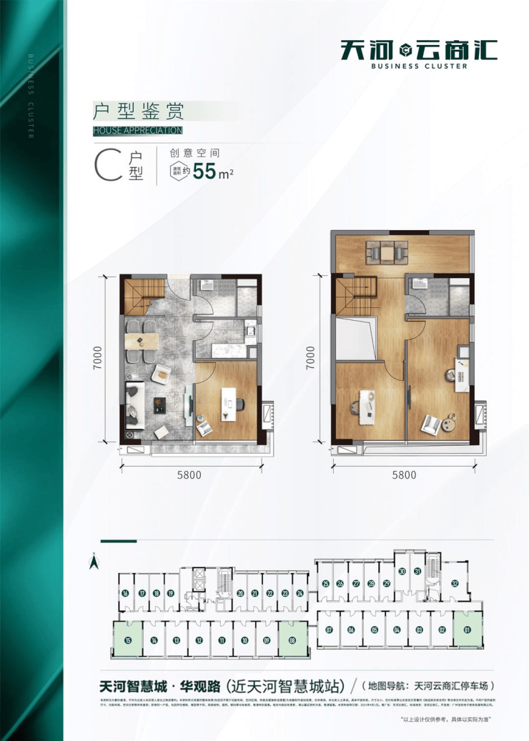 其中,创意LOFT建筑面积约30-55㎡,企业总部建筑面积约155-900㎡,总套数约1700套。