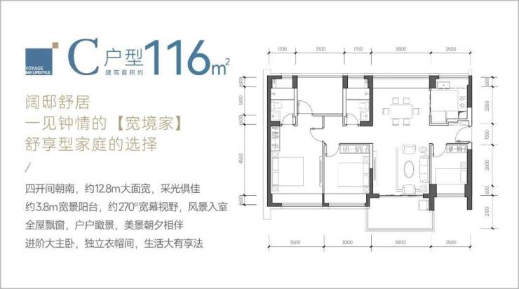 116㎡的4房2厅2卫,C户型,设计的是竖厅南北通透格局,餐客厅一体化设计,客厅3.8米开间,四开间朝南,4个卧室分别做到了主卧17.85㎡/次卧11.4㎡/次卧9.3㎡/次卧8㎡(包含墙体飘窗),都不用搭配飘窗做床,U型厨房,卫生间干湿分离,得房率约:93.13%(包含赠送),阳台主朝西南、东南或正南向。