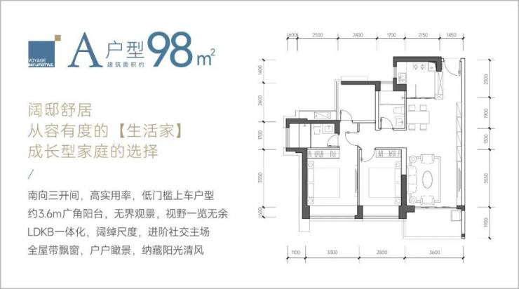 98㎡的3房2厅2卫,设计的是经典竖厅格局,LDKB一体化设计,客厅3.6米开间,三开间朝南,动静分区,3个卧室分别做到了主卧13.69㎡/次卧11.62㎡/次卧5.76㎡(包含墙体飘窗),都不用搭配飘窗做床,L型厨房,卫生间干湿分离,得房率约:89%(包含赠送),西南、东南或正南朝向。