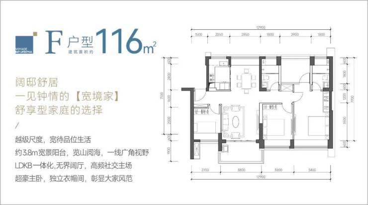 116㎡的4房2厅2卫,F户型,设计的是竖厅南北通透格局,餐客厅一体化设计,客厅3.8米开间,四开间朝南,4个卧室分别做到了主卧18.02㎡/次卧12.3㎡/次卧8.7㎡/次卧8.37㎡(包含墙体飘窗),都不用搭配飘窗做床,L型厨房,卫生间干湿分离,得房率约:88%(包含赠送),阳台主朝西南或东南向。