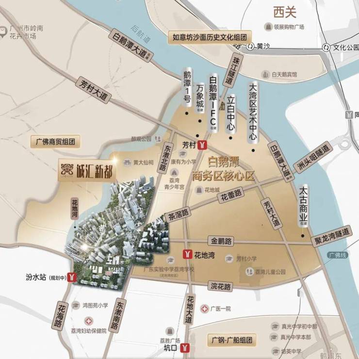 地铁:项目直距1公里范围内,1号线花地湾站、25号线汾水站(规划)双地铁环绕,畅达海珠、越秀;