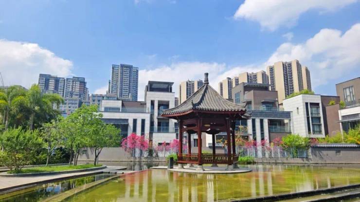 沁园的一期是一百套大师级别墅,每一套都是独一无二的经典设计,将室外室内完美融合,干挂石外墙,青石浮雕,门当户对,高耸院门,宽阔院落,院墙灰砖黛瓦,室内7.5米中空挑高豪华客厅足以彰显大家风范,南方独有的天井院设计藏风纳气,是设计大师的匠心独运,让人住环境与春夏秋冬自然调适,健康延年,恰应了《道德经》所讲的“人法地,地法天,天法道,道法自然”。每一层的设计各有用途,更是各有千秋,全窗Low-E中空玻璃,室内可270度无障碍看天边云卷云舒,赏朝霞夕阳,听雀叫蝉鸣。放眼望去,园区的小径散发着梅兰竹菊的文化气息,而远处创新公园的山林,似乎还能听得见松涛阵阵,嗅得到花果飘香。整套设计浑然天成,当属岭南中式院墅的开山之作,不可多得。
