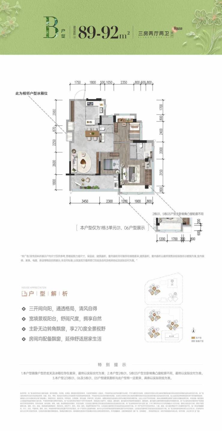 89-92㎡的3房2厅2卫,B户型,设计的是竖厅格局,客厅3.45米开间,LDKB一体化,S墙设计预留冰箱卡槽位,三开间朝南,动静分区,主卧270无边转角飘窗,3个卧室分别做到了主卧18.1㎡/次卧9.44㎡/次卧5.98㎡(包含墙体飘窗),客厅连接次卧出5.75米长的大阳台,U型厨房,公卫三段式分离,得房率约93-99%(包含赠送),西南或东南朝向。