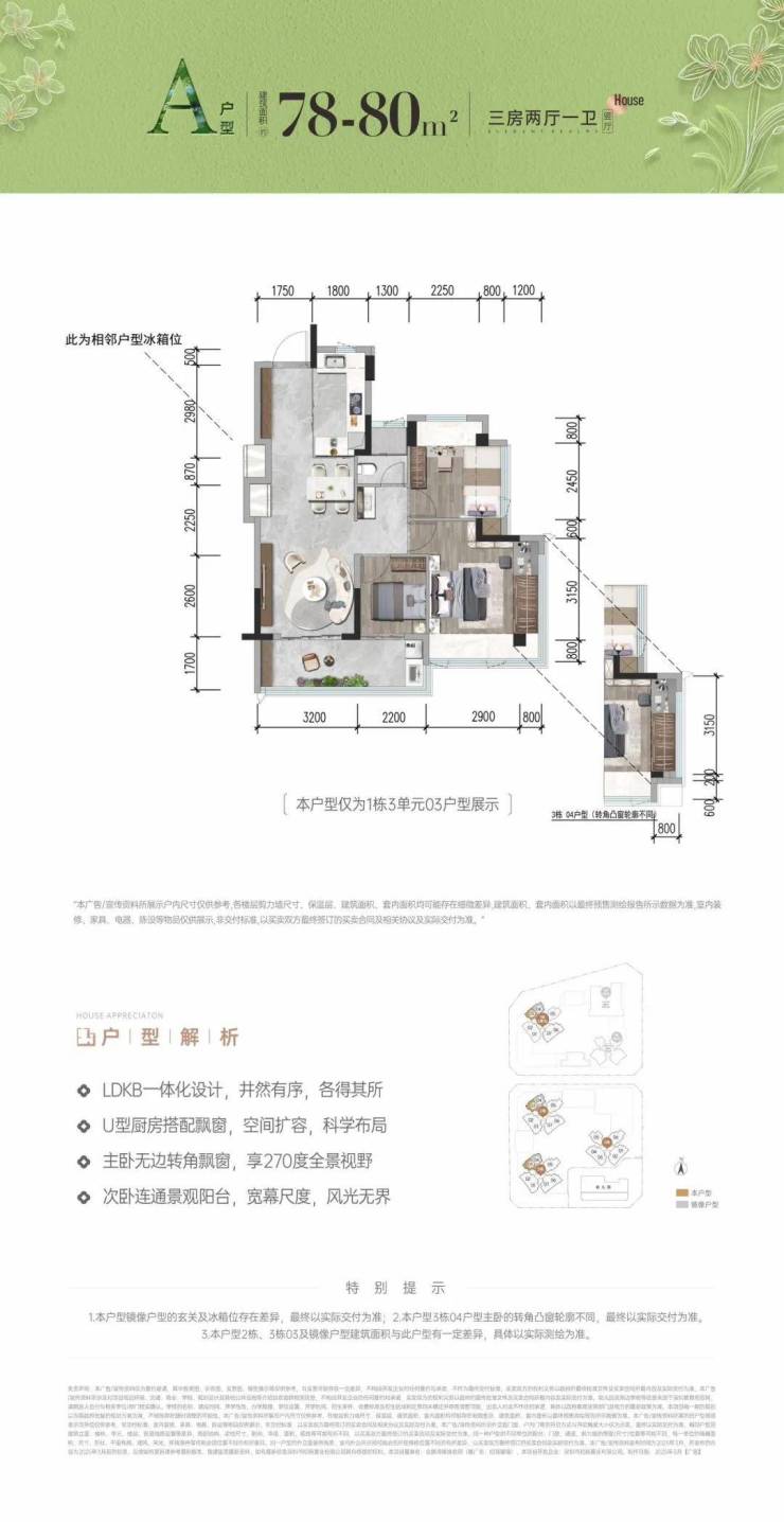 78-80㎡的3房2厅1卫,设计的是竖厅格局,客厅3.2米开间,LDKB一体化,S墙设计预留冰箱卡槽位,动静分区,主卧270无边转角飘窗,3个卧室分别做到了主卧16.62㎡/次卧9.27㎡/次卧5.72㎡(包含墙体飘窗),客厅连接次卧出5.4米长的大阳台,U型厨房,卫生间三段式分离,得房率约93-99%(包含赠送),西北朝向。