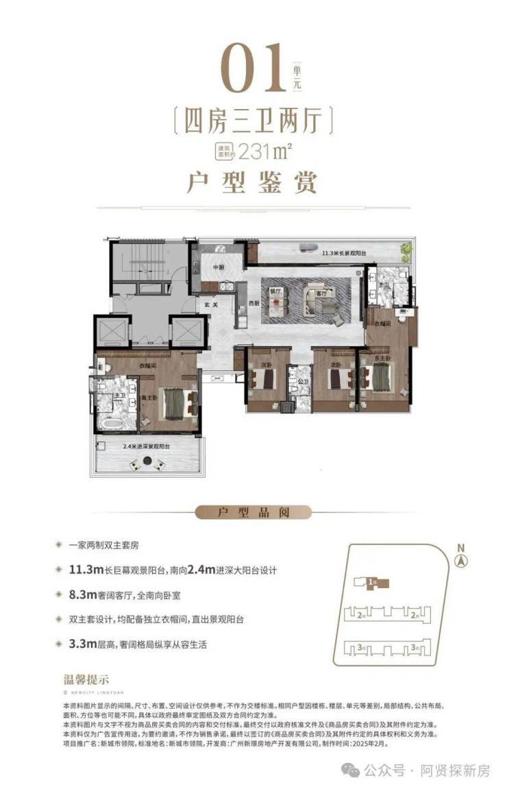 ◎01户型:建筑面积约231㎡奢阔四房。