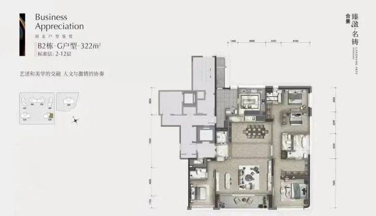 《户型品鉴之商业大平层》商业大平层有 322 平四房两厅五卫和 403 平四房两厅五卫两种户型,层高约 3.5 米,整体格局合理,动区空间充足。