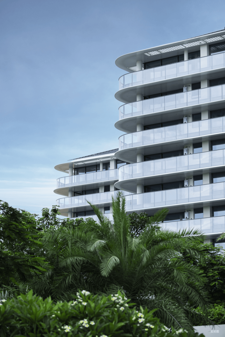 在建筑风格上,以“海洋灵动曲线”为设计语言,从海洋动态中汲取灵感,通过铝板与玻璃所呈现的横向柔美线条,打破固有审美,让建筑呈现出“云上花园之居,水上漂浮之所”的海洋灵动感。
