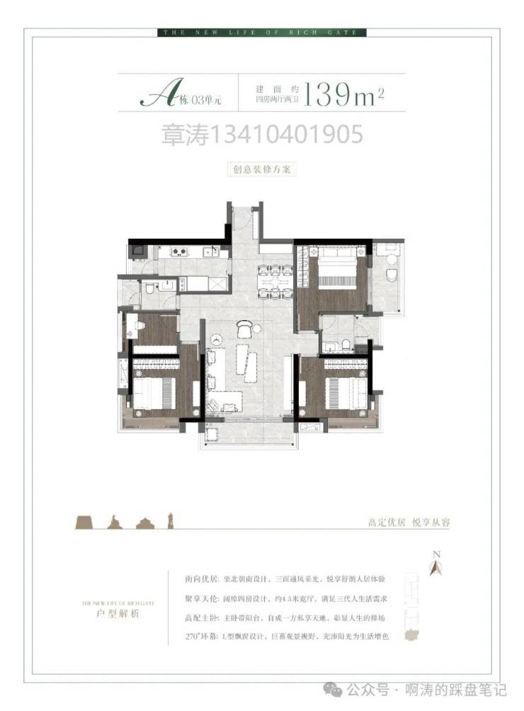 A栋03单元三面采光三阳台139㎡稀缺南向四房户型: