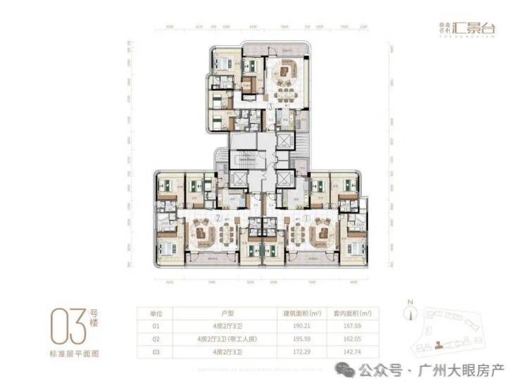 项目由14栋12层小高层组成,产品涵盖123-352㎡三至五房,共8类户型,户型实用率约82-84%