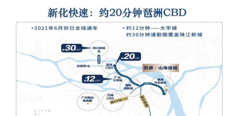 好处是项目自驾还算方便,目前南大干线已经全线开通,去往南站、万博、大学城、创新湾等地都很快,比如去往琶洲,仅仅26分钟的车程时间