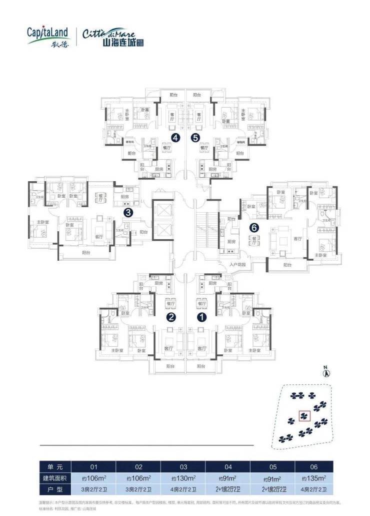 项目一共有5个面积段,分别是85平三房两厅一卫,91/106平三房两厅两卫,130平A户型五房两厅两卫,130平B和135平户型四房两厅两卫。