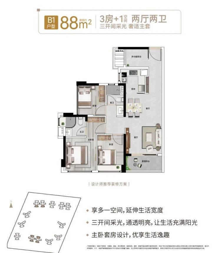 【88㎡:3房+1(空间)2厅2卫】(竖厅)