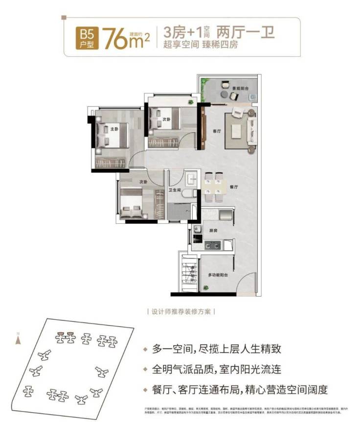 【76㎡:3房+1(空间)2厅1卫】