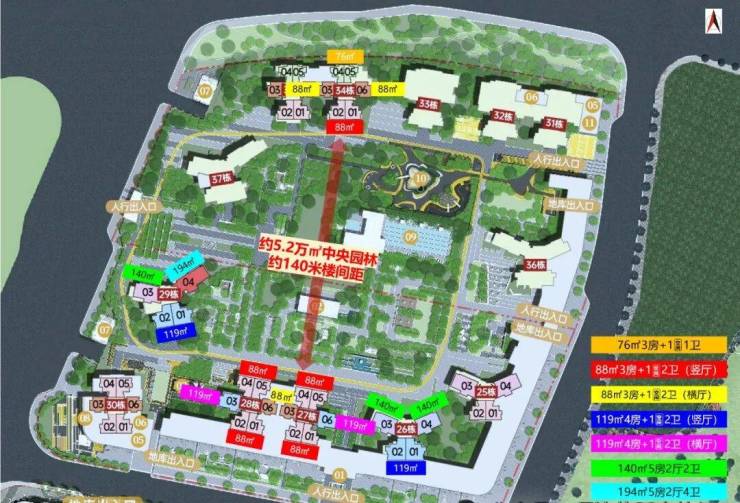 三开间采光,望中央园林景观,超百米楼距