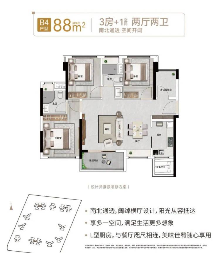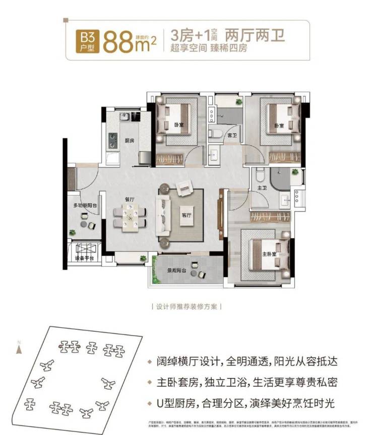 【88㎡:3房+1(空间)2厅2卫】(横厅)