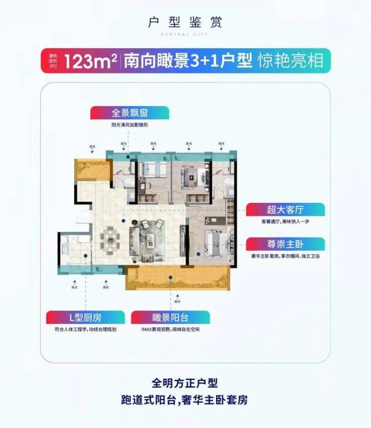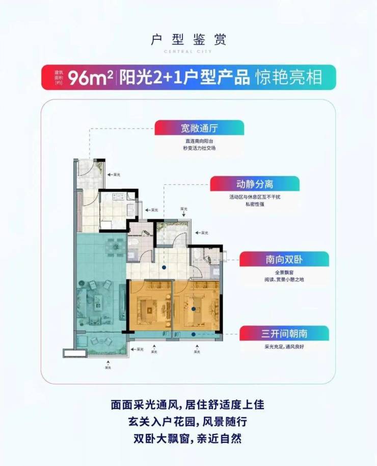 合生中央城提供的户型设计注重实用性和舒适性。项目主推建面约85-197平方米的三至四房洋房和空中复式云墅,满足不同家庭的需求。其中,85平方米的三房户型紧凑实用,适合刚需家庭;而110平方米和123平方米的户型则更为宽敞舒适,适合改善型家庭。所有户型均经过精心设计,确保每一户都能享有充足的采光和优美的景观视野,提升了居住的舒适度和幸福感。