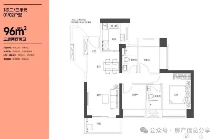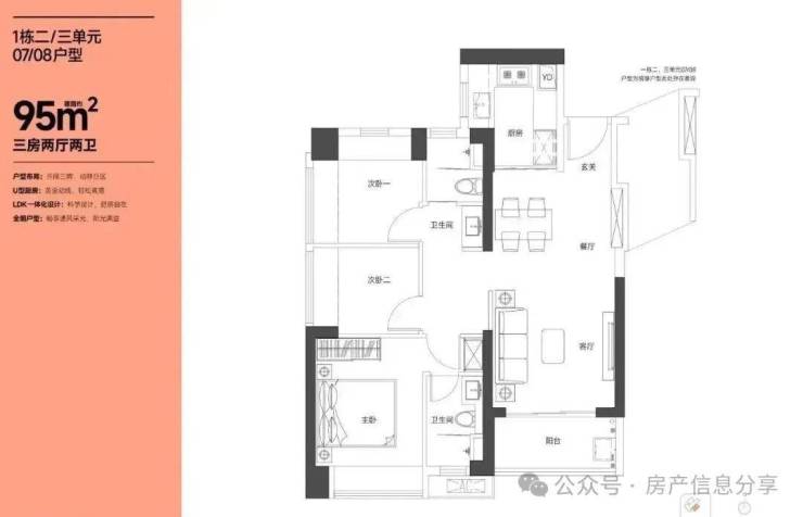 95㎡的3房2厅2卫,设计的是竖厅格局,LKDB一体化设计,进门入户玄关,有1个次卧做的双飘窗,U型厨房,卫生间三段式分离,得房率:74.34%(不含赠送),全部东南朝向。