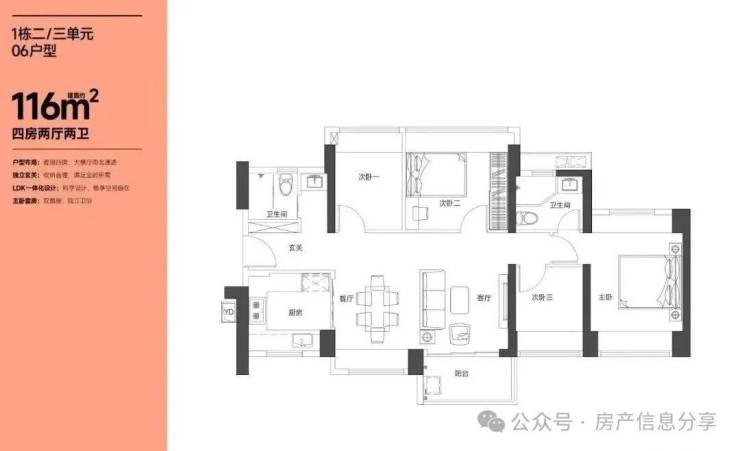 116㎡的4房2厅2卫,设计的是横厅南北通透格局,LKDB一体化设计,进门入户玄关,五开间朝南,超大宽面,主卧南北通设计,U型厨房,得房率:74.35%(不含赠送),阳台主朝东南向。