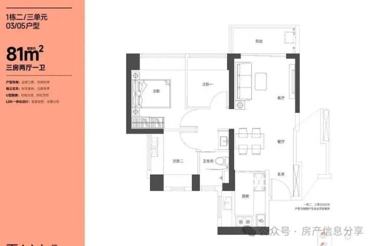 81㎡的3房2厅1卫,设计的是竖厅格局,LKDB一体化设计,进门入户玄关,有1个次卧做的双飘窗,U型厨房,卫生间三段式分离,得房率:74.34%(不含赠送),全部西北朝向。