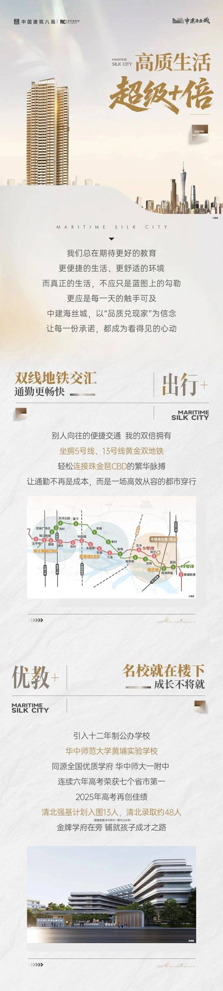 中建海丝城项目总改造面积1682亩,总建筑面积330万平米,践行“四大城市”和“九个一流”开发理念,以一流的规划营造一流的环境、打造一流的产品,引入国内一流的旗舰商业和一流的教育资源,建设集总部办公、高端公寓、商业服务、文化体验、高端居住五大功能于一体的“国际智创集聚区、岭南山水宜居区”,全力打造广州沿江东进发展战略上的标杆项目和国家级低碳示范城区。中建海丝城在打造人文、公园、低碳和智慧四大城市的基础上,以“六边形配置”全方位提升产品力回应城市的厚爱,更以高品质住宅兑现百姓对“好房子”的期许。